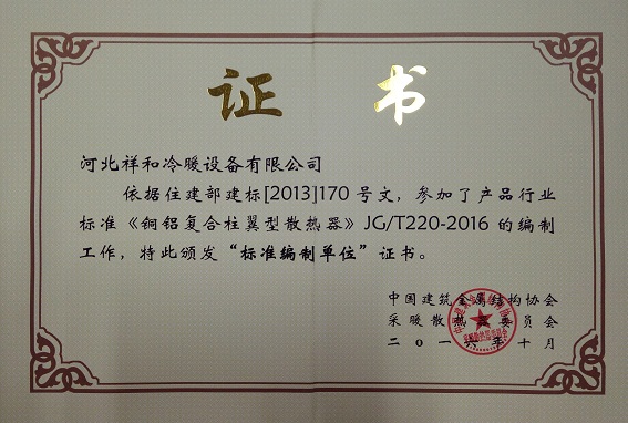 河北祥和冷暖設(shè)備有限公司成為鋼制板型散熱器“標(biāo)準(zhǔn)編制單位”